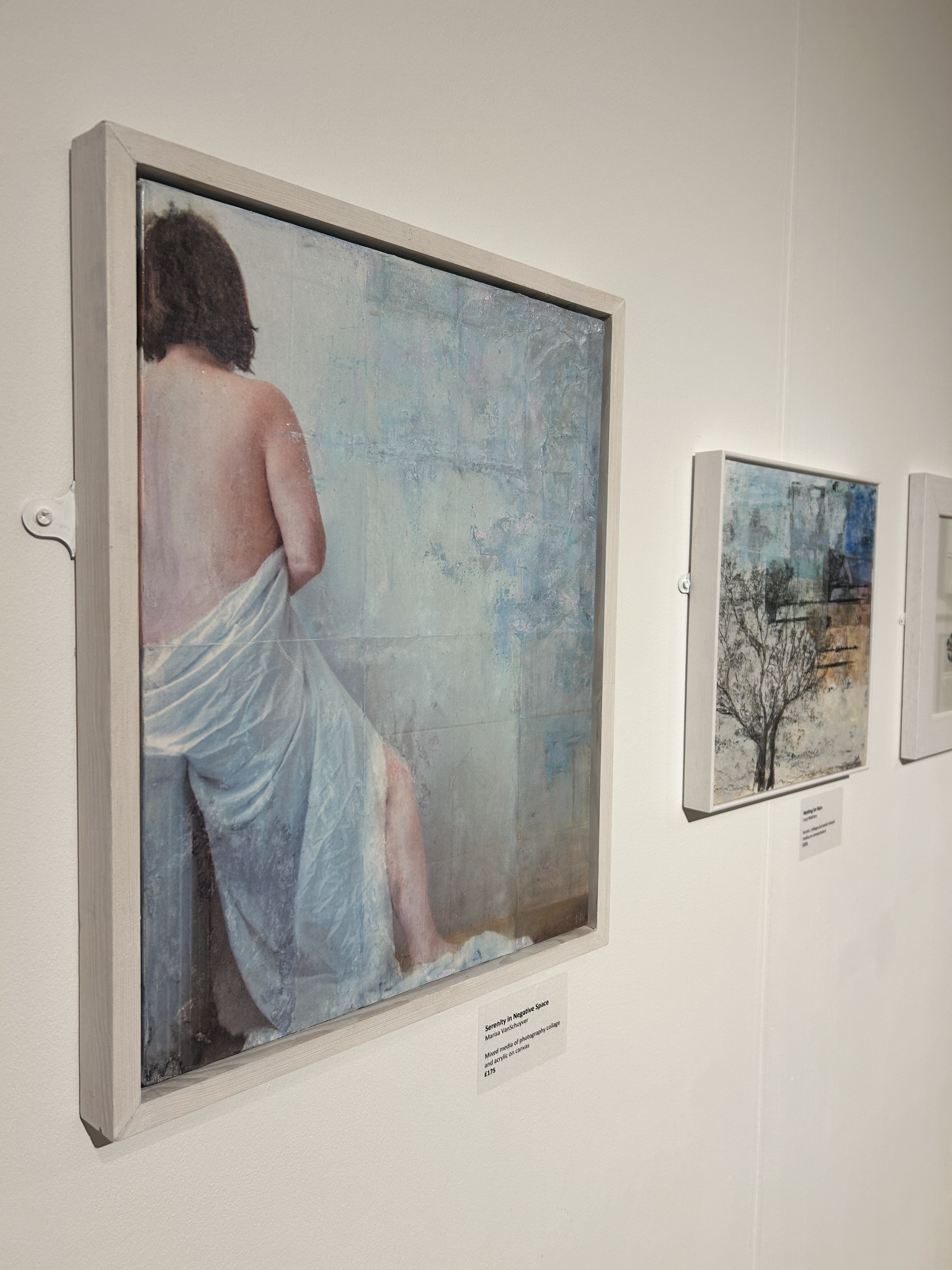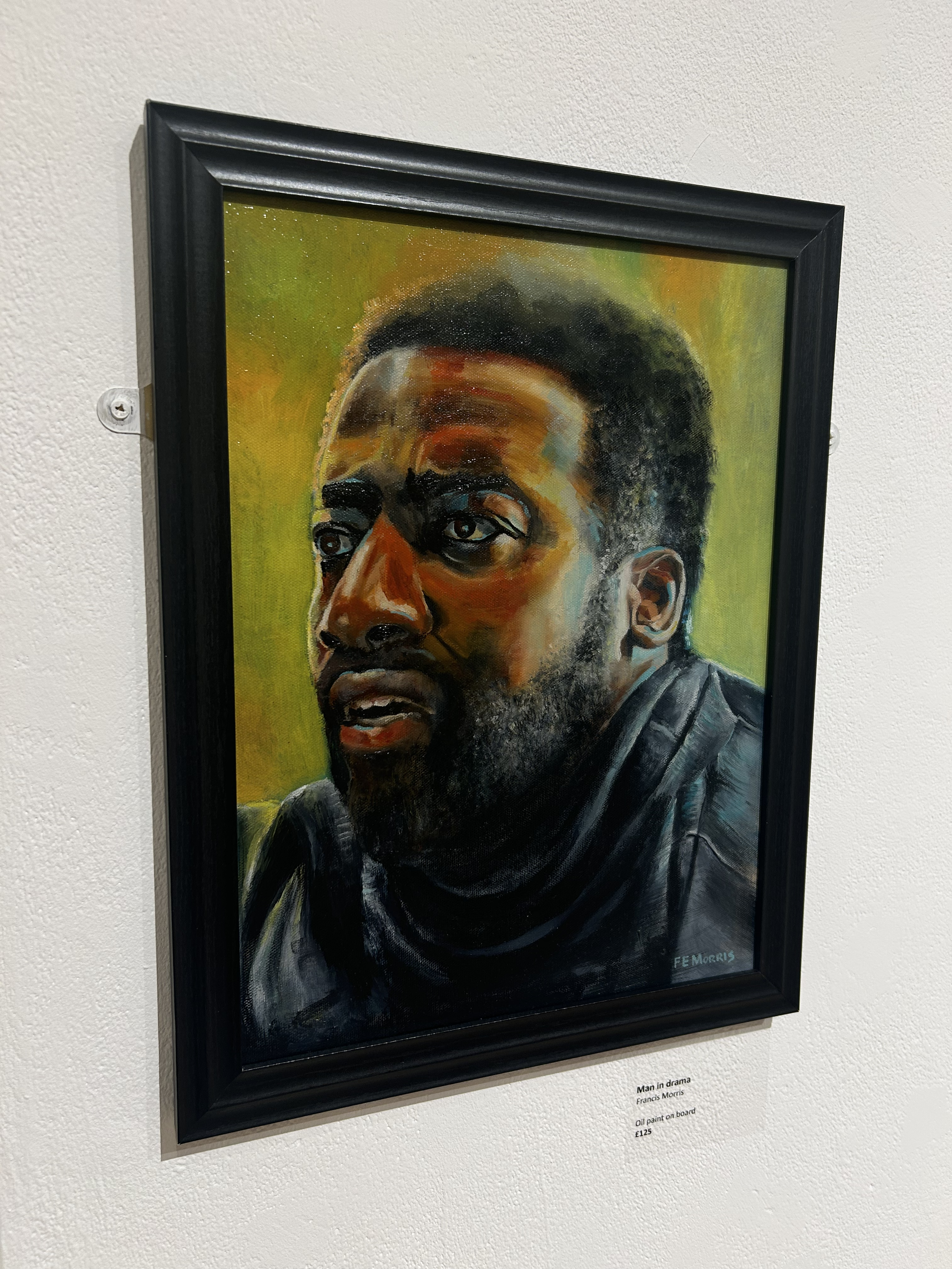 Walk through the gallery and you're confronted by intimacy rendered in wildly different languages. Francis Morris's 'Man in Drama' <02> arrests you immediately: oil paint pushed thick and deliberate, golden light catching vulnerability in the sitter's gaze. It's classical portraiture with emotional weight that feels utterly contemporary.