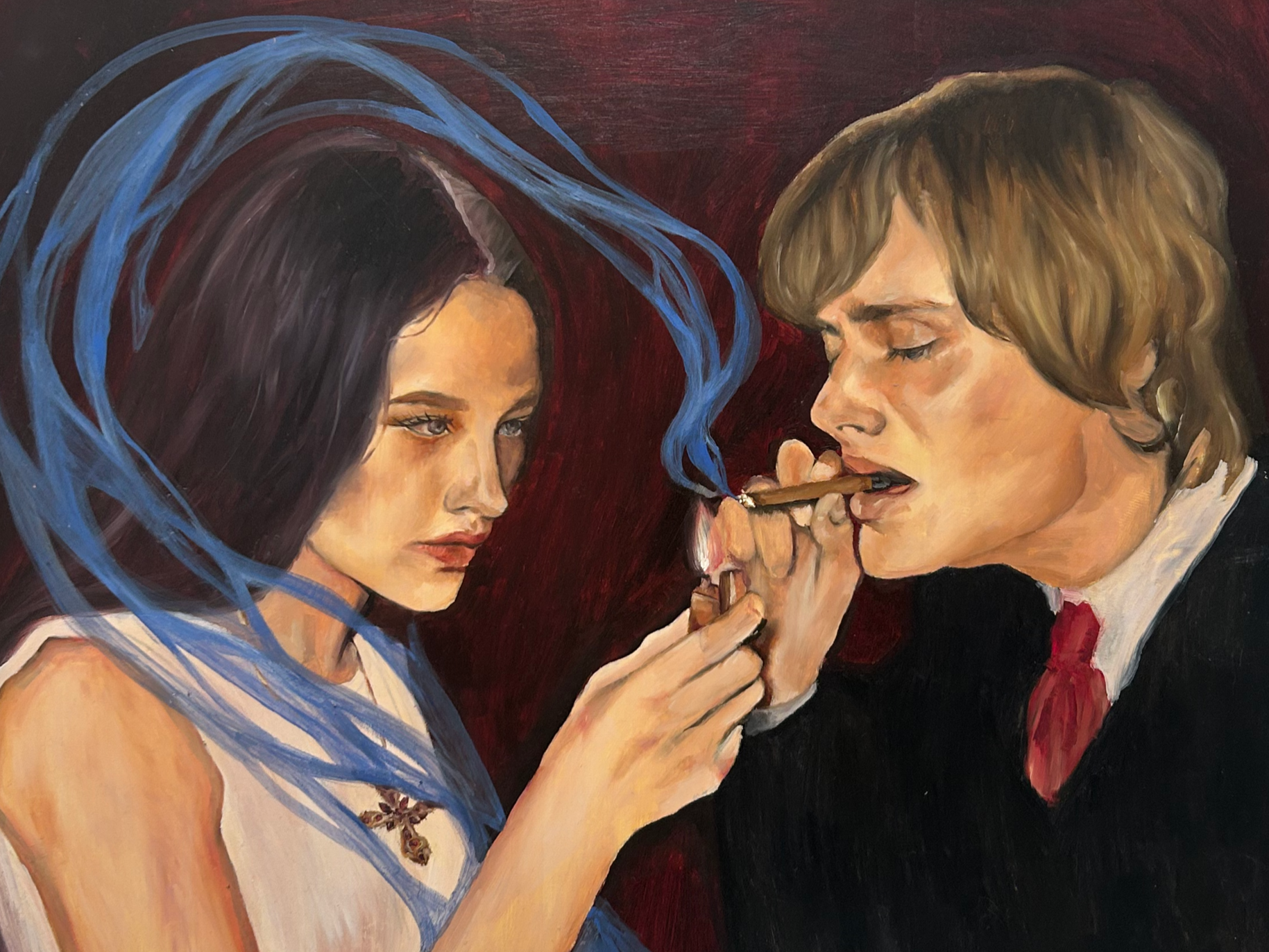 Then there's the disquiet of Morgan Brand's 'Blue Banisters', where two figures occupy the same canvas but entirely different psychological spaces. The blue ribbon snaking between them operates like a binding or a barrier—you can't quite tell which. It's unsettling, accomplished work.