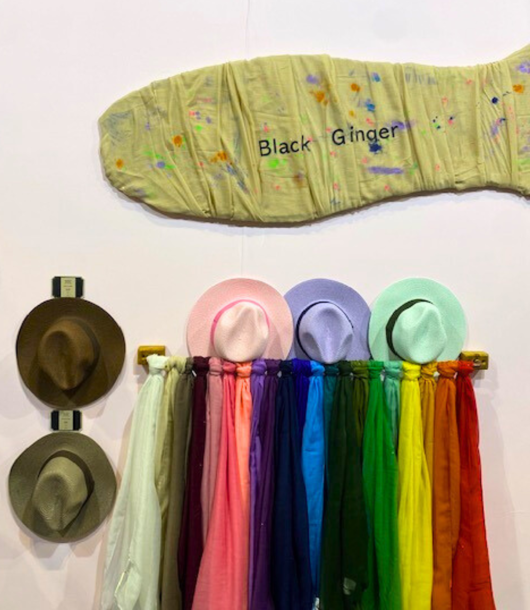 A foldable sun hat is practical. For Black Ginger, it’s an accessory of colour, nature, and confidence. Scarves lined the wall in rainbow knots, pastel hats dotted above, and a surfboard-shaped sign wrapped in taupe kaftan fabric smeared with neon paint splashes — the brand name discreetly printed in black.